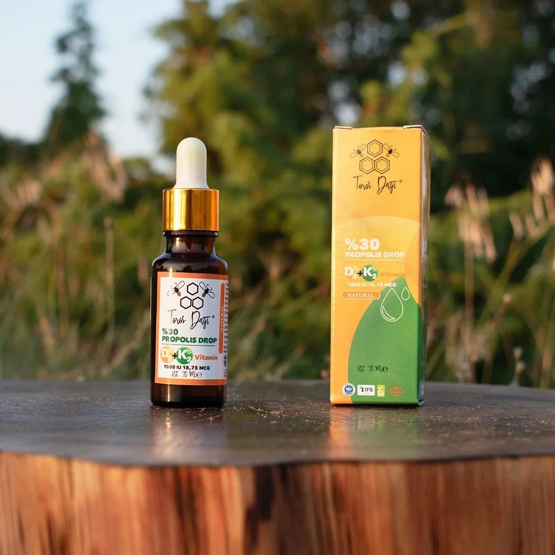 Propolis Damla D3 K2 vitamin Torosdagi Bal in ozel bir arı ürünüdür. Zeytinyağı ile çözülen bu ürün alkol içermez. Ayrıca koruyucu, tatlandırıcı ve katkı gibi yapay malzemeler kullanılmamıştır. Toros Dağı Bal tarafından %100 doğal olarak üretilen propolis damlayı güvenle kullanabilirsiniz. D vitamini kullanimlarinda dogallik ve hrlal olmasini onemsiyorsaniz bu urun tam size gore.