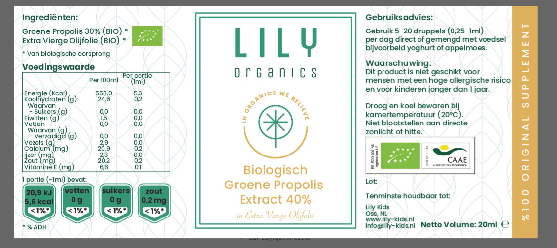 Lily Organics’in ürettiği %15 propolis ekstraktı özellikle çocuklar için tasarlanmıştır, çünkü su bazlıdır. Pek çok propolis ekstraktı alkolle üretildiği için çocuklar için uygun değildir. Lily Organics’in yeşil propolisi 3 yoğunlukta sunulur: %15, %30 ve %40.